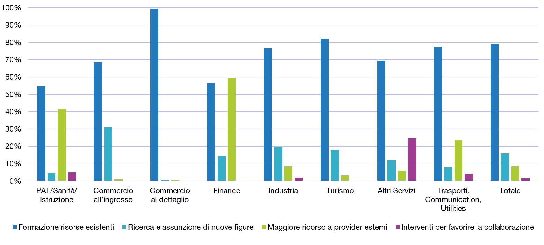 La formazione delle risorse esistenti, quale attività prevalente alla ricerca di competenze digitali, non è molto differenziata per settore, anche se le aziende del Commercio al dettaglio sono quelle che tendono ad utilizzare praticamente solo questo approccio, mentre solo il settore Finance privilegia l’utilizzo di provider esterni in affiancamento (quasi alla pari) alla formazione interna.