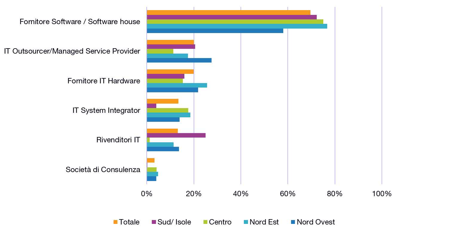 Il partner per eccellenza della Trasformazione Digitale è il Software Vendor. Tuttavia, emergono alcune limitate specificità se si osservano i dati a livello territoriale: in particolare, nelle regioni meridionali si attribuisce un certo ruolo anche al canale (25%), mentre nel nord ovest si guarda anche al ruolo degli outsourcers e dei managed service providers (28%).