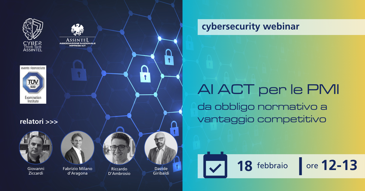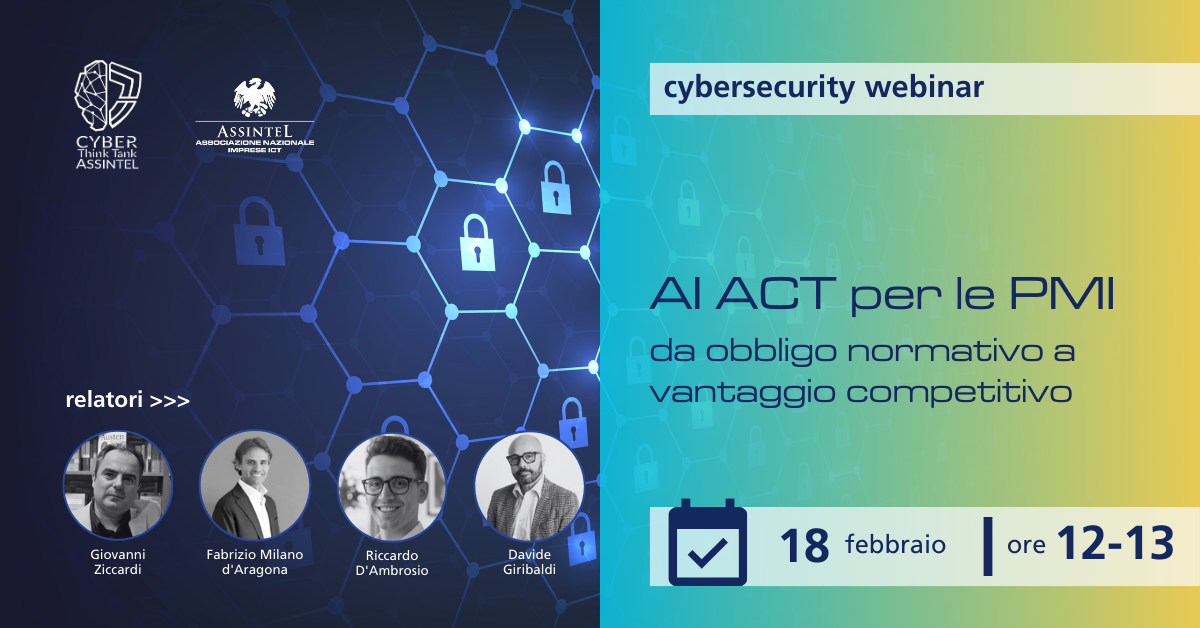 Webinar, 18 febbraio 2026 dalle ore 12:00 alle ore 13:00. Questo webinar offre una guida pratica e accessibile per comprendere gli adempimenti richiesti e trasformare gli obblighi normativi in leve strategiche per l’innovazione, la competitività e per rendere l'AI un alleato nella crescita aziendale. A cura del Cyber Think Tank di Assintel.
