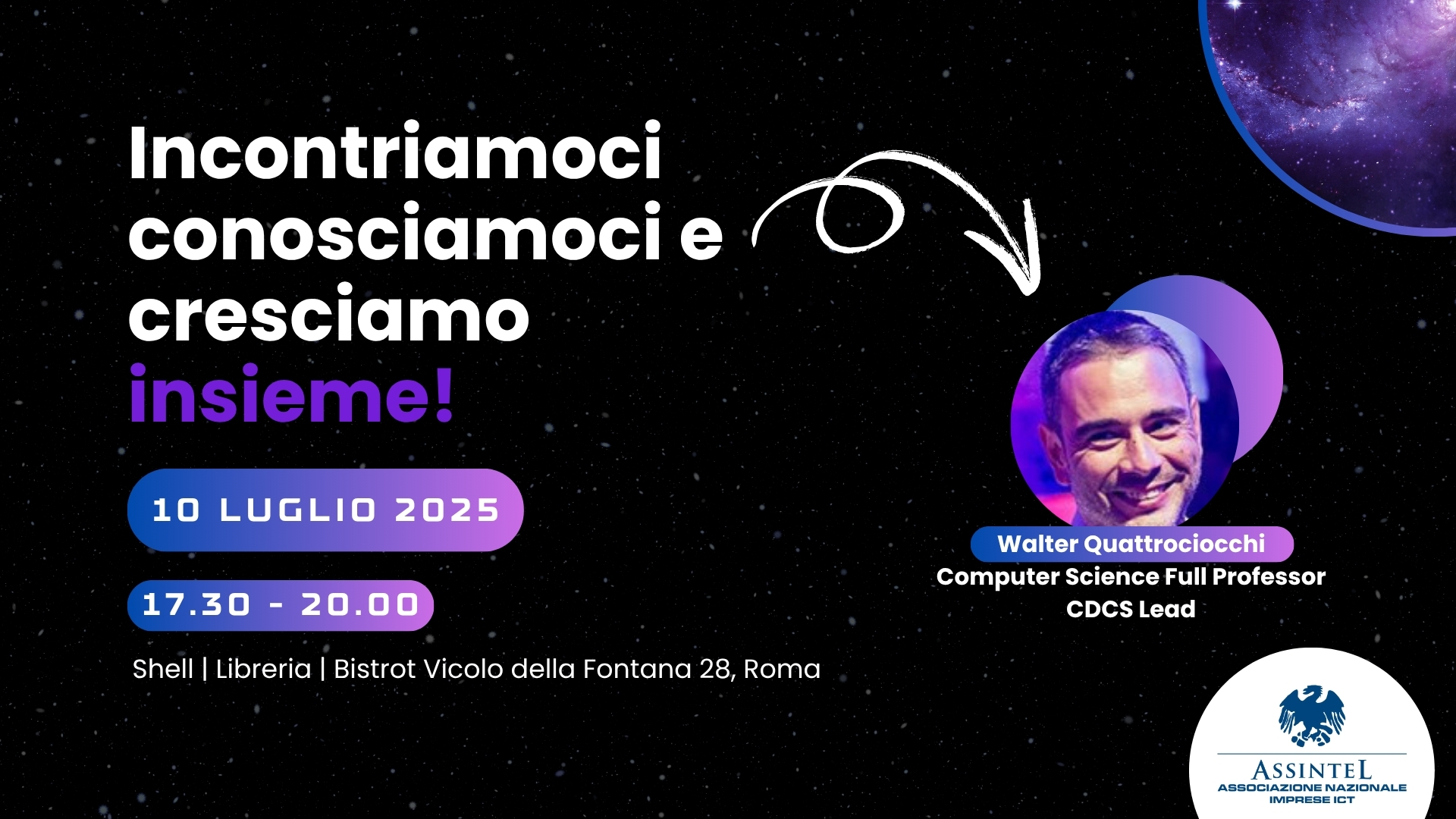 Walter Quattrociocchi, Computer Science Full Professor e autore del libro “In che mondo vivi”, sarà ospite della serata stimolando la conversazione tra i partecipanti delle imprese associate. A finire l’ormai tradizionale aperitivo di networking. Ti aspettiamo!