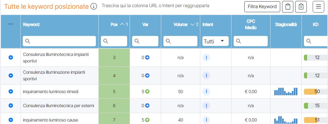 Fatta quindi una AUDIT TECNICA e STRATEGICA si parte, un lavoro difficile perchè si parte da sotto terra e prima di prendere aria e luce occorrerà passare dal purgatorio di Google ed ecco dopo 8 mesi la luce, il primo movimento nella SERP, alcune parole .