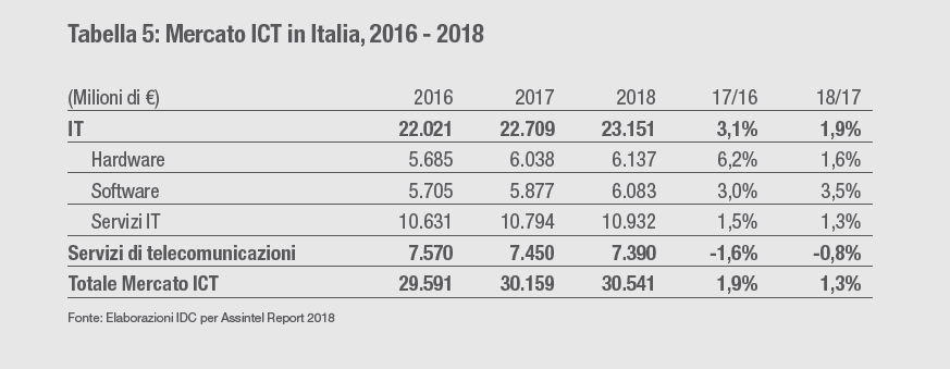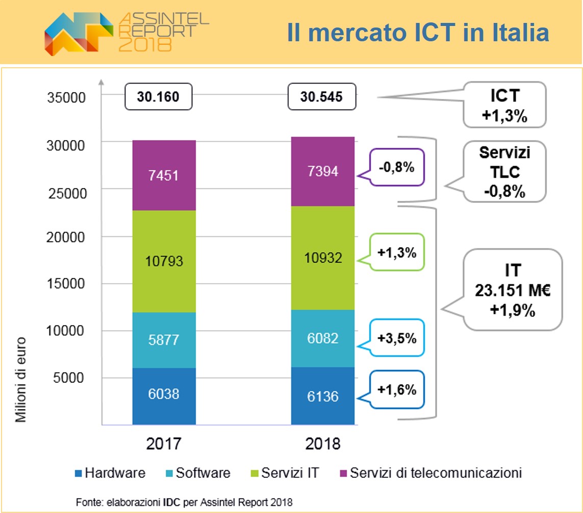 Questi i dati che emergono dalla presentazione del nuovo Assintel Report, la ricerca sul mercato ICT e Digitale in Italia, realizzato da Assintel, Associazione Nazionale delle Imprese ICT e Digitali, con CFMT insieme alla società di ricerca indipendente IDC Italia. Il progetto, patrocinato dall’Agenzia per l’Italia Digitale e con la partnership di Confcommercio, è stato realizzato con il contributo di 6 aziende associate che credono fortemente nel valore dell’innovazione come driver indispensabile all’evoluzione del nostro sistema: Adfor, Cast, Etna Hitech, Gruppo 36, M-cube, Present.